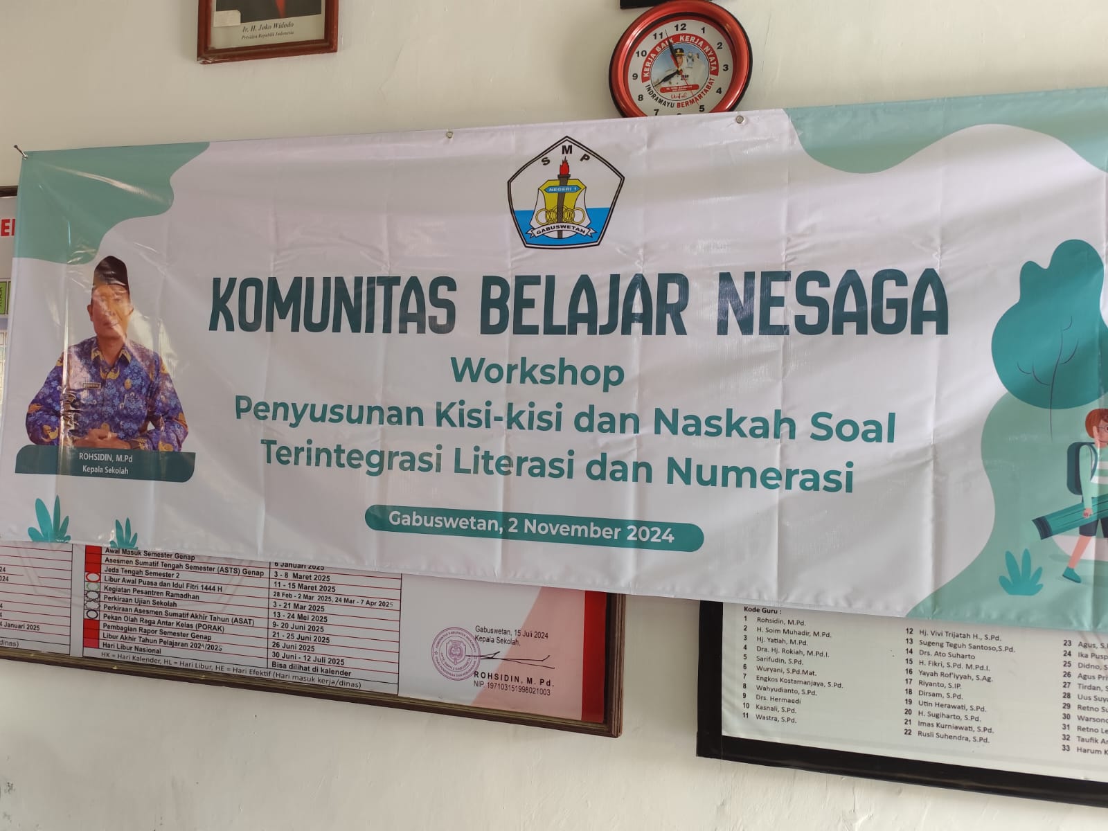 Komunitas Belajar NESAGA (SMPN 1 Gabuswetan) kembali menggelar kegiatan workshop penyusunan kisi-kisi dan naskah soal terintegrasi literasi dan numerasi yang diadakan pada tanggal 2 Nopember 2024 di ruang guru SMPN 1 Gabuswetan.
