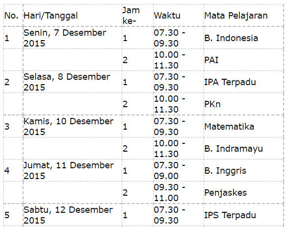 | 5 | Sabtu, 12 Desember 2015 | 1 | 07.30 - 09.30 | IPS Terpadu |